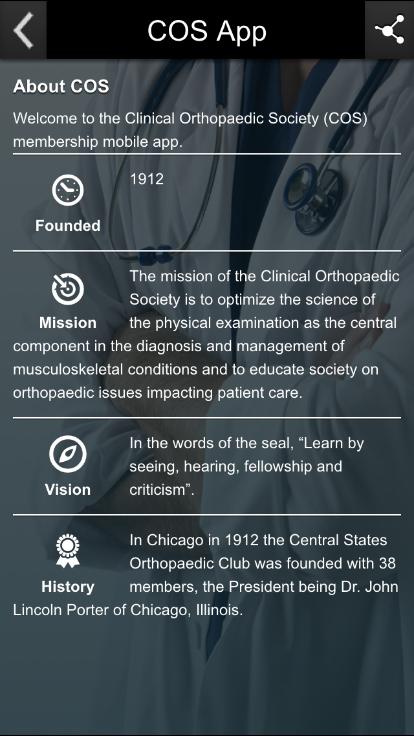 Misi masyarakat ortopedi klinis adalah untuk mengoptimalkan ilmu pemeriksaan fisik sebagai komponen sentral dalam diagnosis dan manajemen kondisi muskuloskeletal dan untuk mendidik masyarakat tentang masalah ortopedi yang memengaruhi perawatan pasien. Fungsi utama masyarakat ortopedi klinis adalah pertemuan tahunannya. Format pertemuan membutuhkan presentasi pasien sebagai bagian dari kertas yang disajikan, dan jalan setapak sentral untuk menunjukkan pasien.